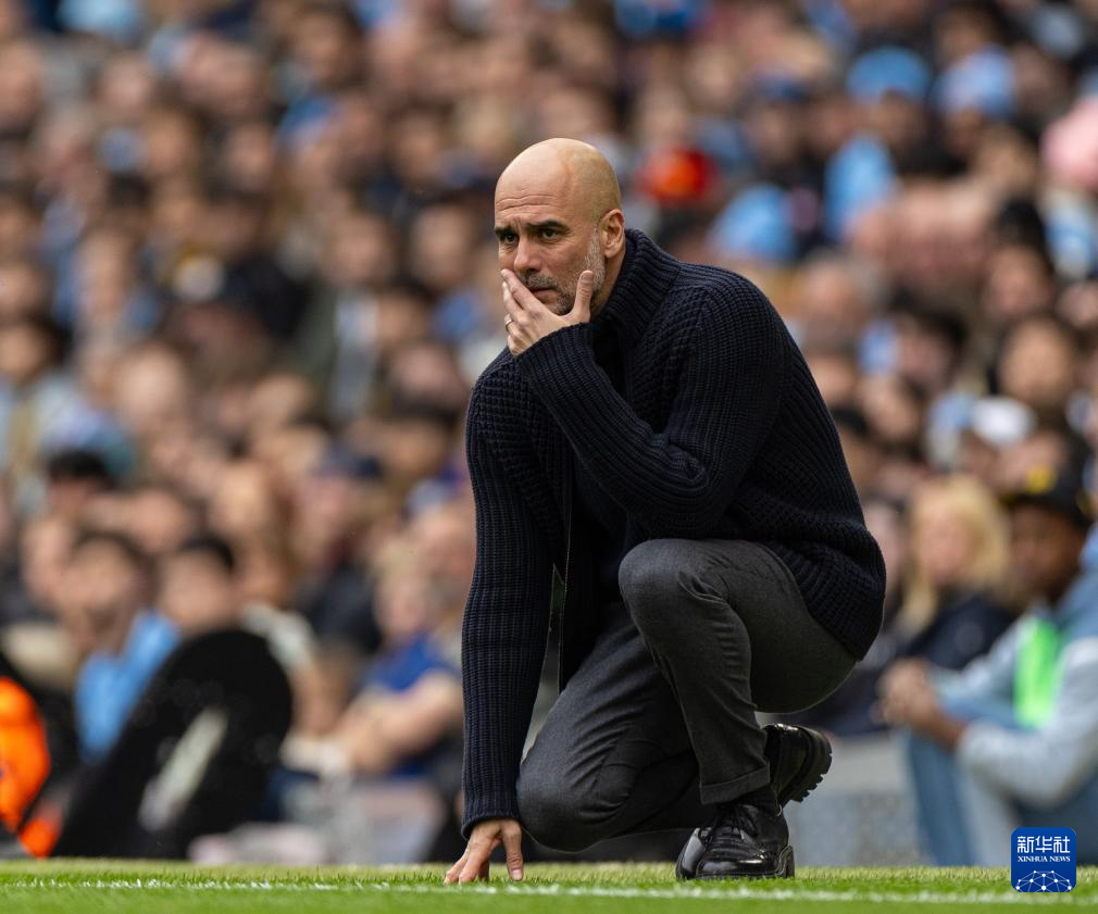 5月4日,曼彻斯特城队主教练瓜迪奥拉在场边观战。新华社发