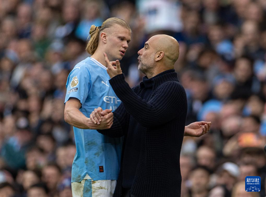 5月4日,曼彻斯特城队球员哈兰德(左)被替换下场时与主教练瓜迪奥拉交流。新华社发