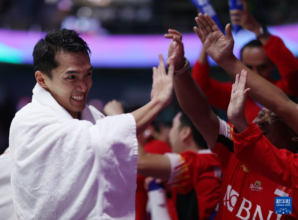 5月4日,印度尼西亚队选手乔纳坦在男子单打比赛后与团队成员庆祝胜利。他2比0战胜中国台北队选手王子维。新华社记者 贾浩成 摄