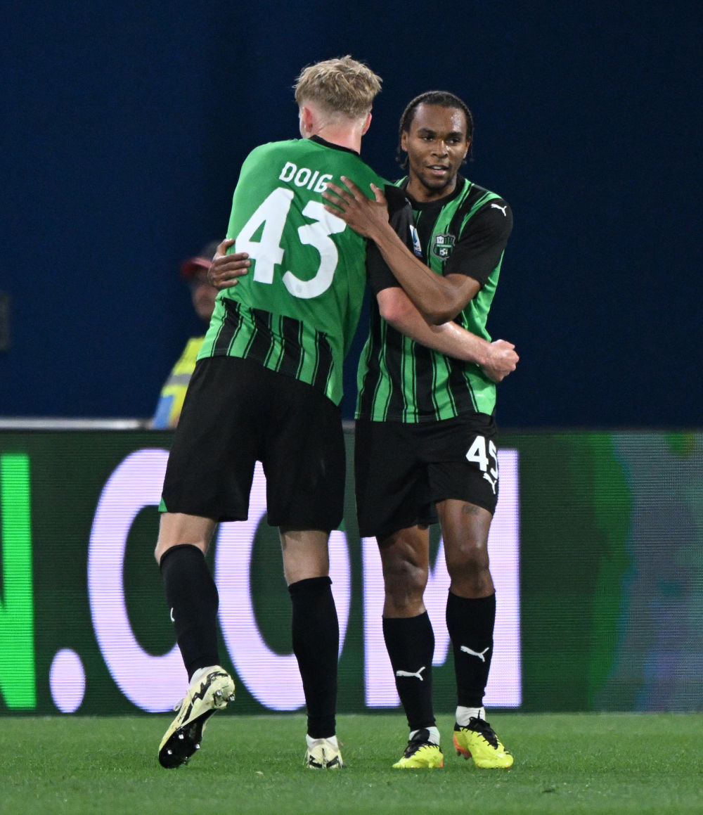 5月4日,萨索洛队球员劳里恩特(右)庆祝进球。新华社发(奥古斯托·卡萨索利摄)