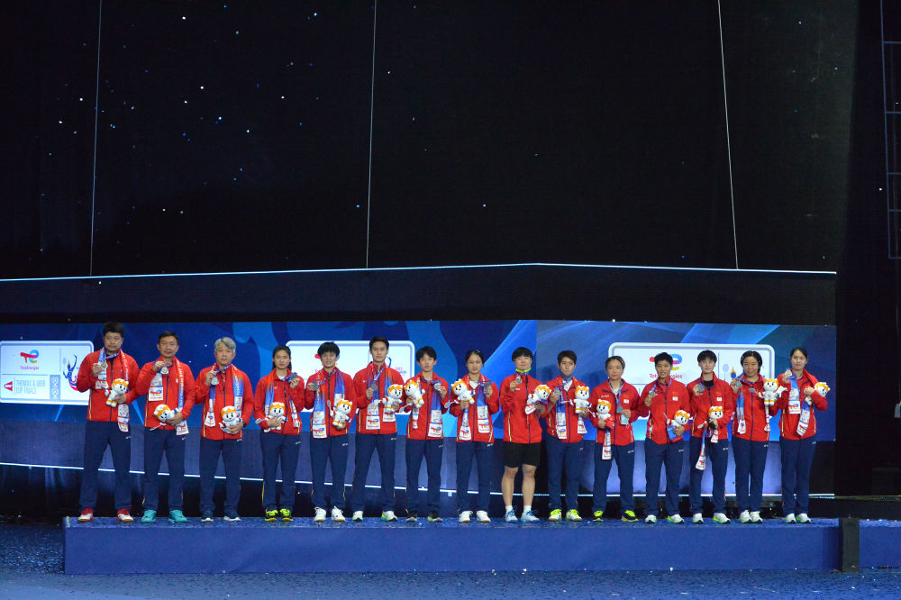 2022年5月14日,在泰国曼谷举行的尤伯杯羽毛球团体赛决赛中,中国队以2比3不敌韩国队,获得亚军。新华社发(拉亨摄)