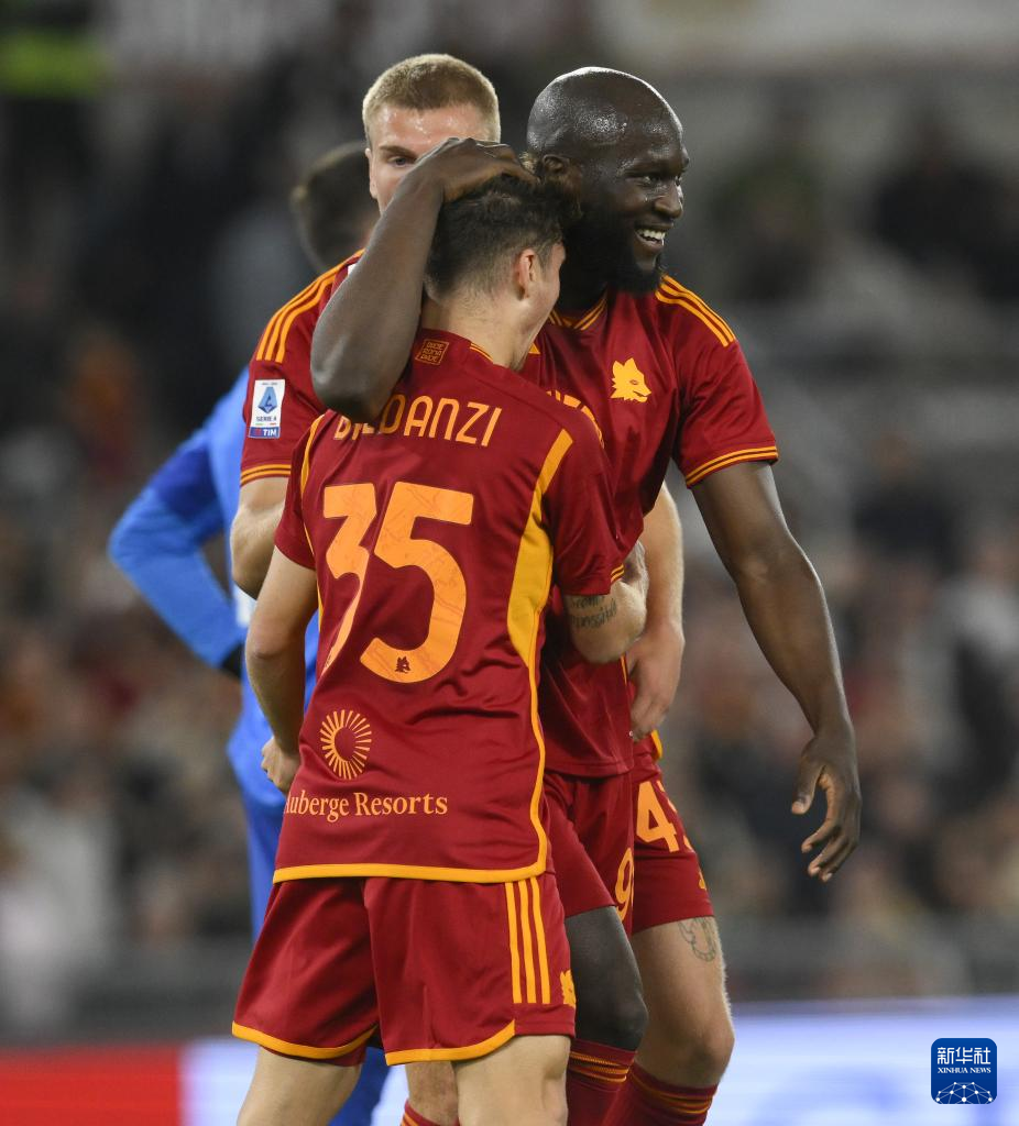 5月5日,罗马队球员卢卡库(右)与队友巴尔丹齐庆祝进球。新华社发(奥古斯托·卡萨索利摄)