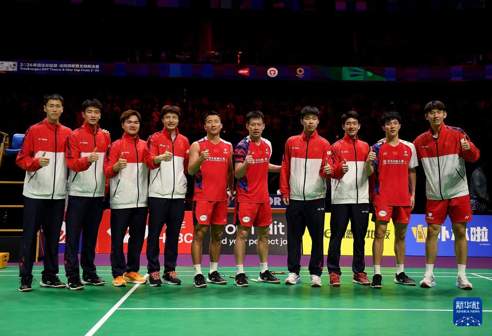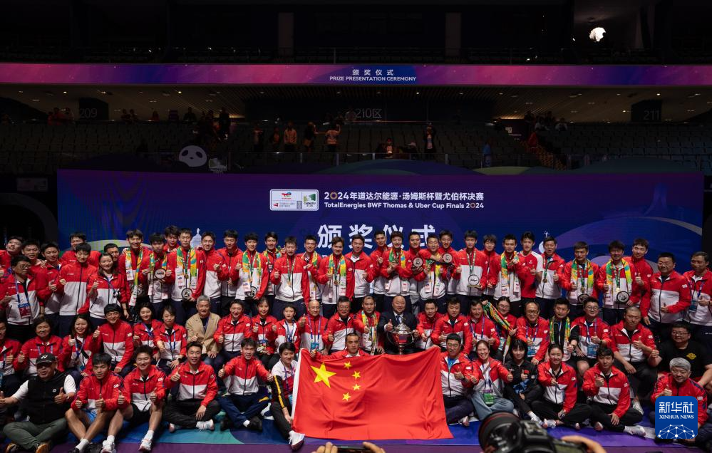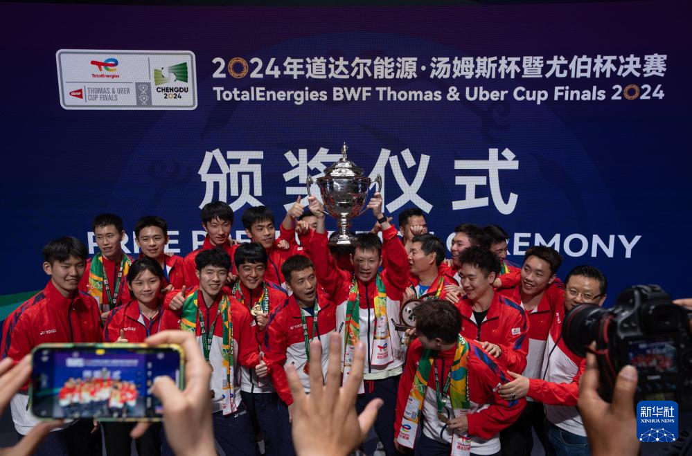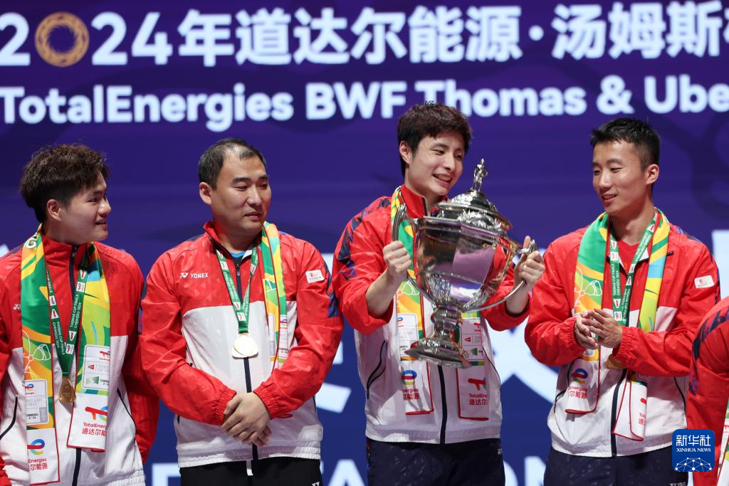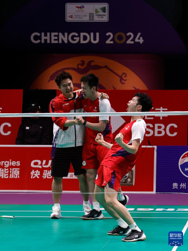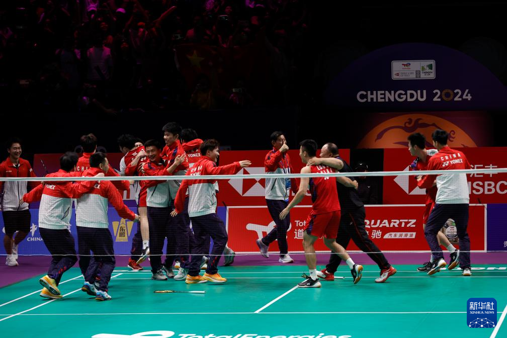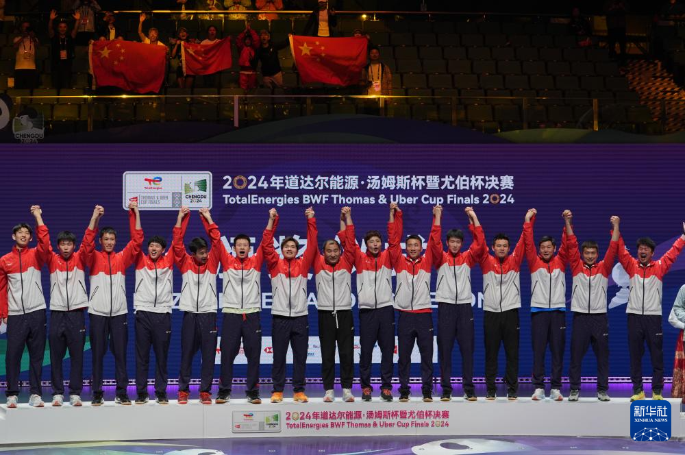 当日,在四川成都举行的2024年汤姆斯杯羽毛球团体赛决赛中,中国队3比1战胜印度尼西亚队,夺得冠军。