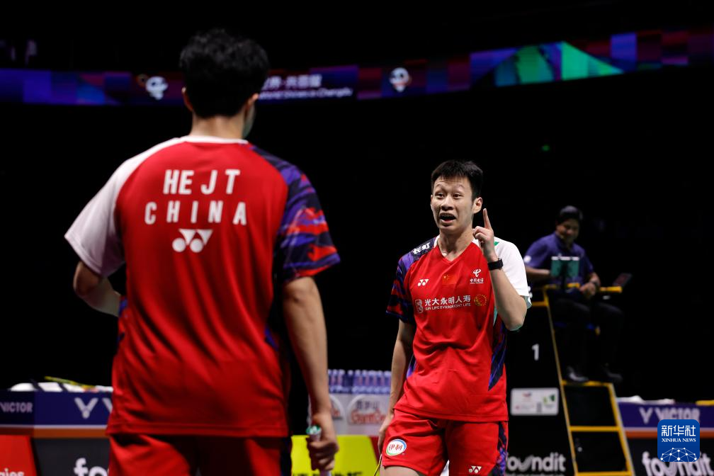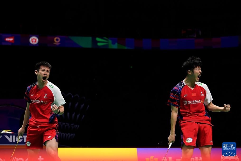 5月5日,中国队组合何济霆/任翔宇(左)在比赛中庆祝得分。最终,他们2比0战胜印度尼西亚队组合菲克里/毛拉纳。新华社记者 沈伯韩 摄