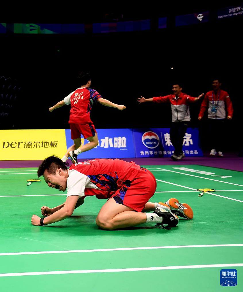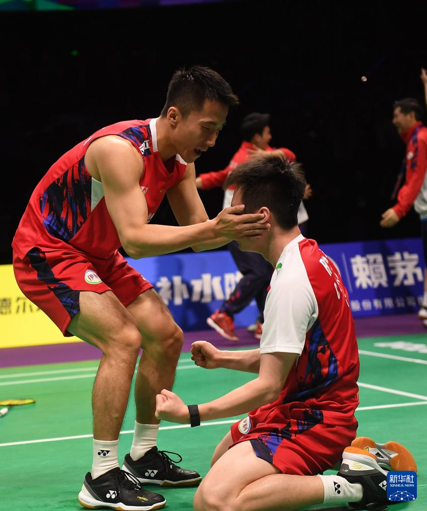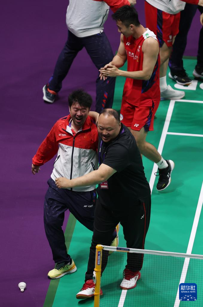 5月5日,中国羽毛球协会主席张军(下右)在比赛后庆祝中国队夺冠。新华社记者 贾浩成 摄