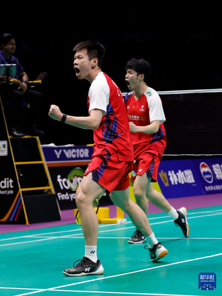 5月5日,中国队组合何济霆/任翔宇(前)在男子双打比赛后庆祝获胜。他们2比0战胜印度尼西亚队组合菲克里/毛拉纳。新华社记者 侯昭康 摄