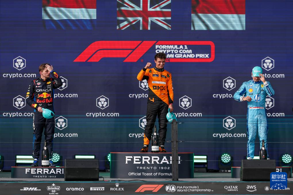 5月5日,冠军迈凯伦车队英国车手诺里斯(中)、亚军红牛车队荷兰车手维斯塔潘和季军法拉利车队摩纳哥车手勒克莱尔在领奖台上。新华社发(钱俊 摄)