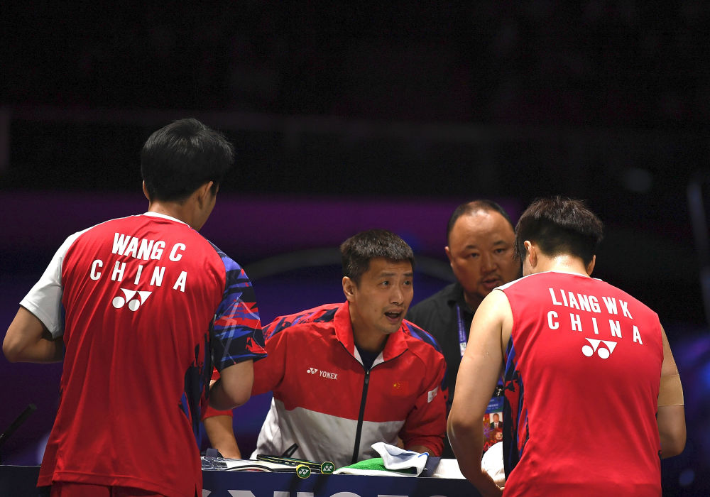 5月4日,中国队教练陈其遒(左二)、中国羽毛球协会主席张军(右二)在比赛间隙指导中国队组合梁伟铿(右一)/王昶。新华社记者 侯昭康 摄