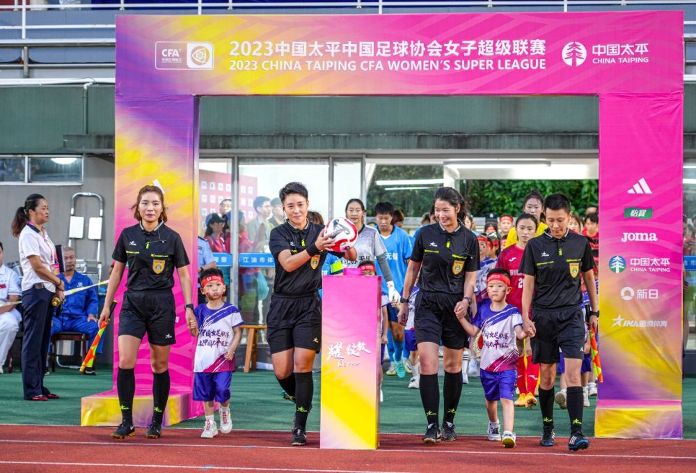 代冰月(左二)执裁2023女超联赛。(图片来自中国足协官网)