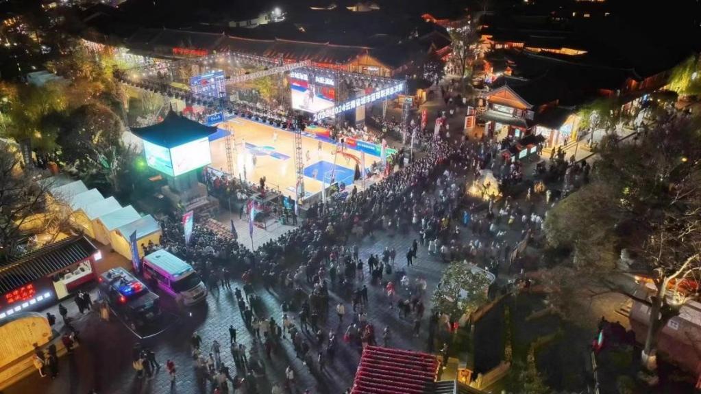 这是3月20日在丽江古城玉河广场举办的云南省城市篮球联赛总决赛现场。