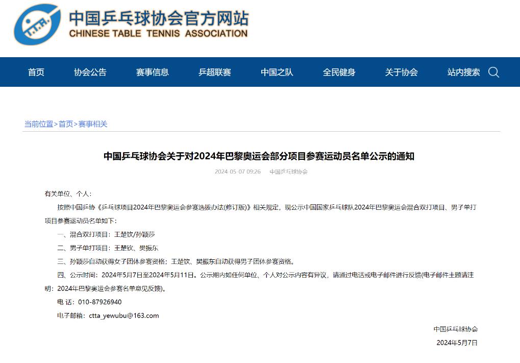 按照中国乒协《乒乓球项目2024年巴黎奥运会参赛选拔办法(修订版)》相关规定,中国乒协对上述名单进行公示。中国乒协还表示,孙颖莎自动获得女子团体参赛资格,王楚钦、樊振东自动获得男子团体参赛资格。