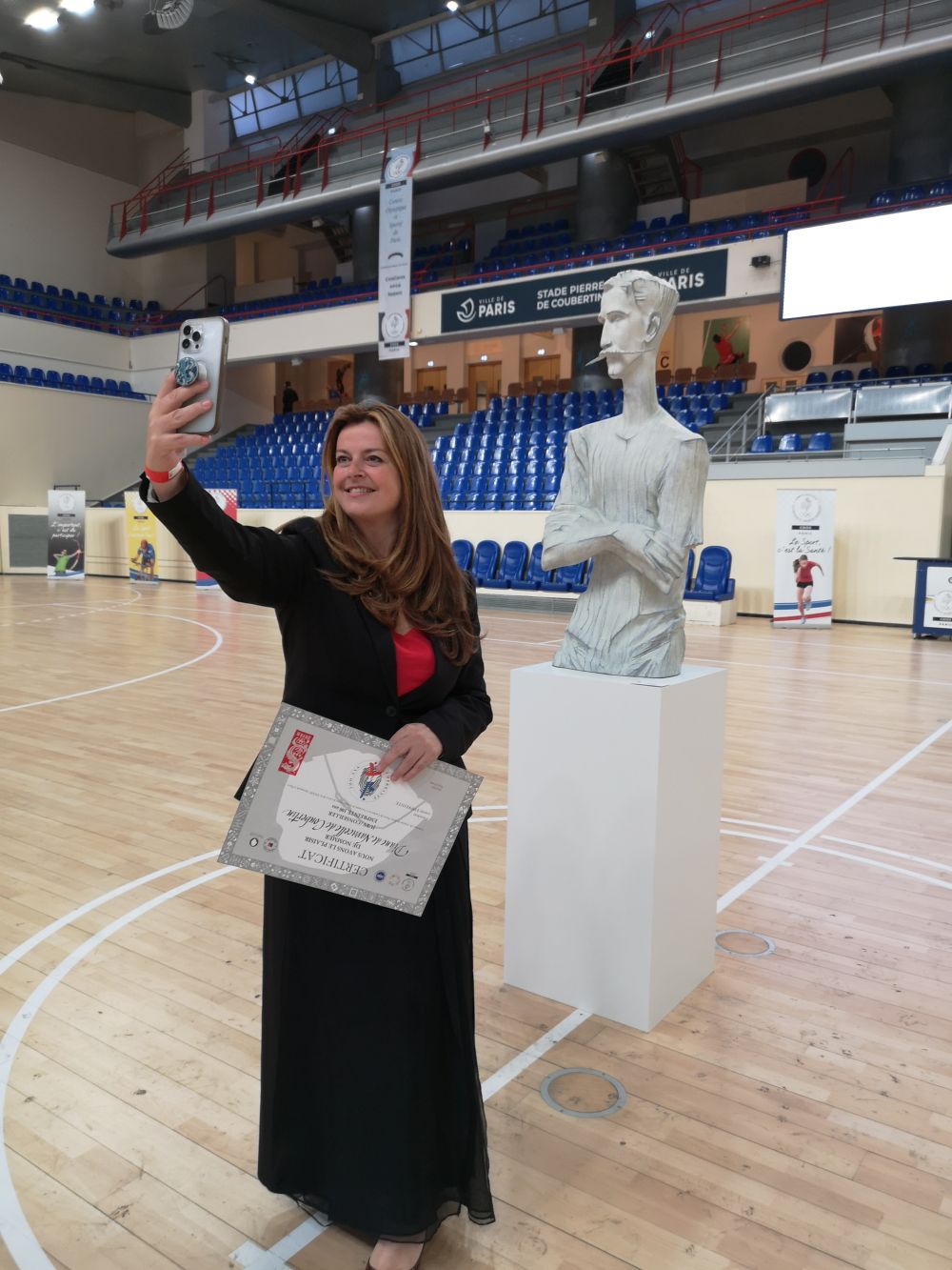顾拜旦家族委员会秘书长迪亚娜·顾拜旦与雕塑合影自拍