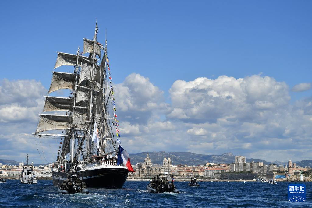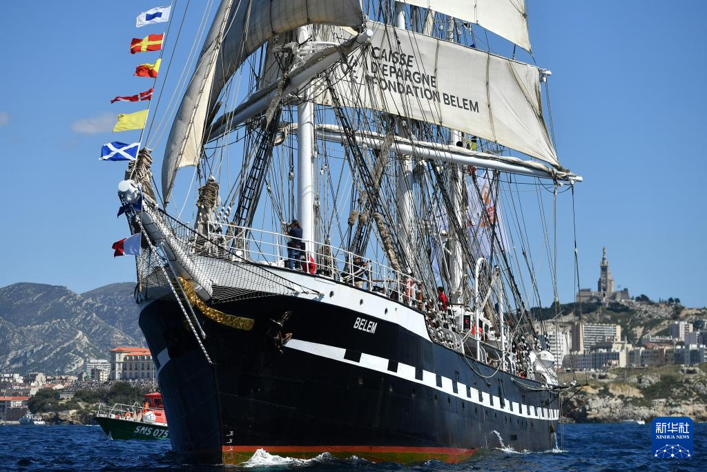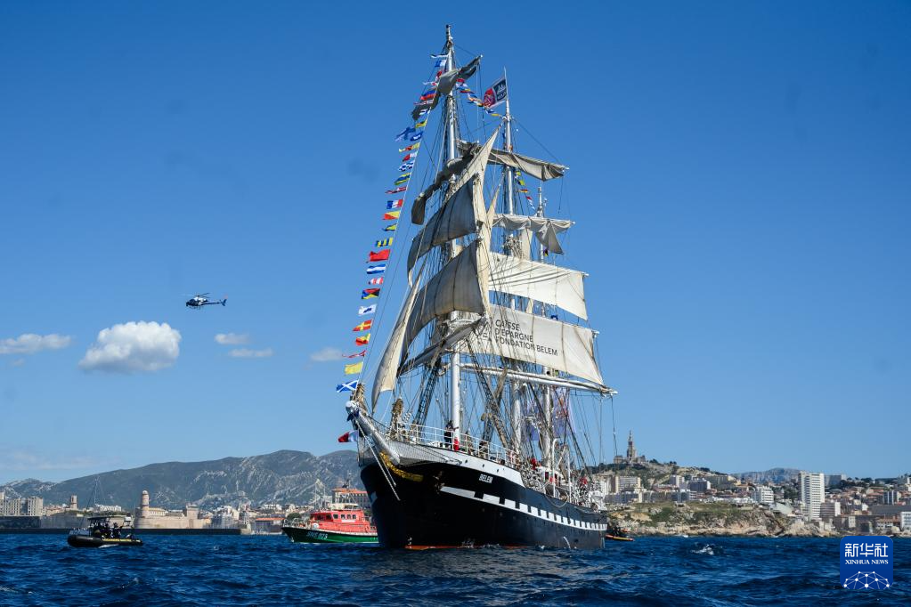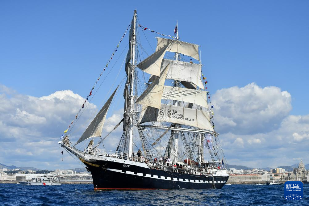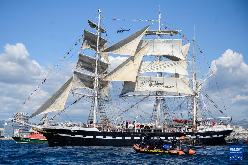 当地时间5月8日,搭载巴黎奥运会火种的“贝勒姆”号帆船抵达马赛。新华社发(朱利安·马蒂亚摄)