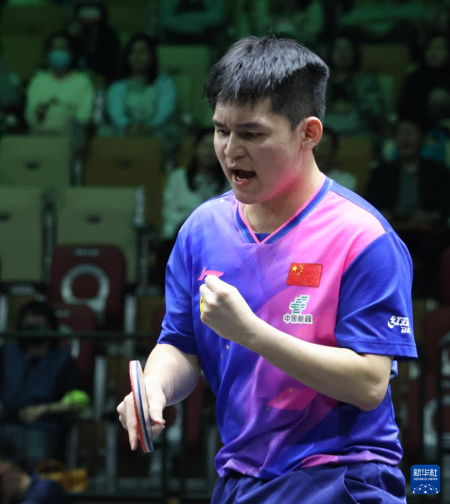 5月9日,林诗栋在比赛中庆祝得分。新华社记者 王海洲 摄