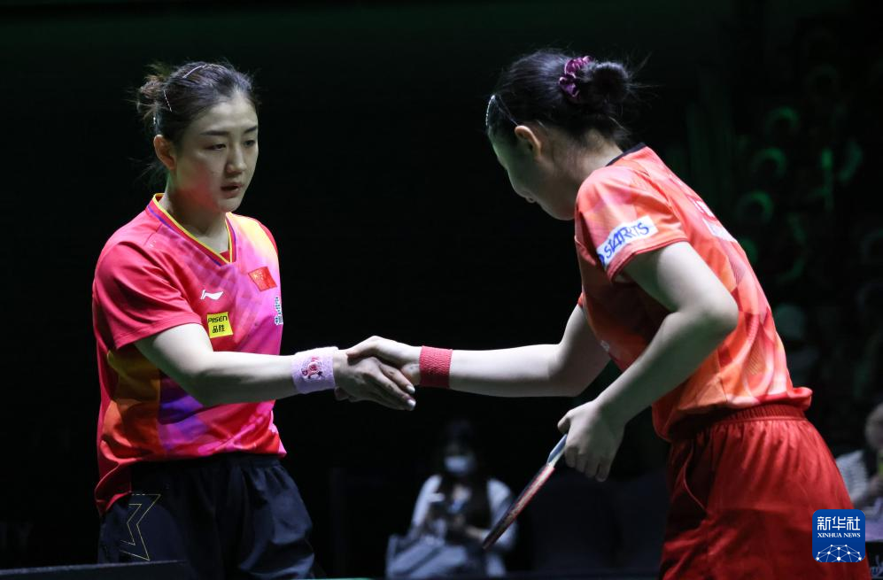 5月9日,陈梦(左)在赛后与张本美和握手。新华社记者 王海洲 摄