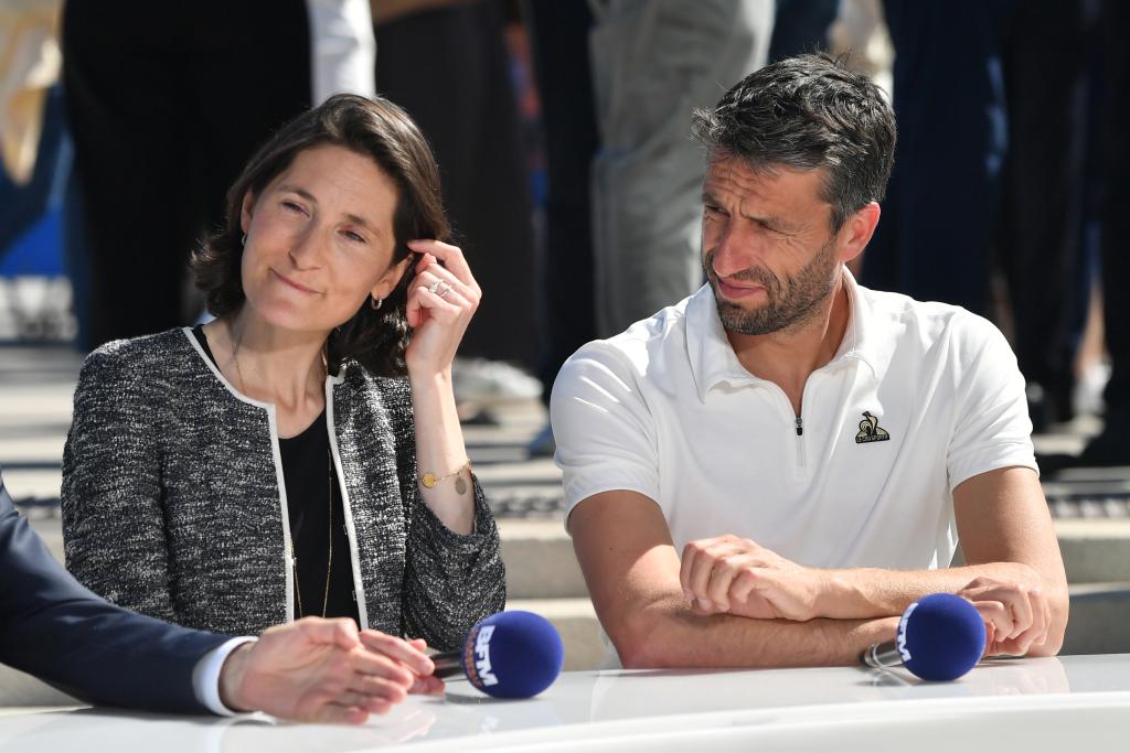 5月9日,法国体育部长卡斯特拉(左)与巴黎奥组委主席托尼·埃斯坦盖在法国马赛出席火炬传递活动。新华社发(朱利安·马蒂亚摄)