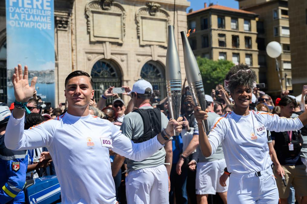 5月9日,火炬手、马赛海军消防员马修·顾戴(左)与火炬手、舞蹈演员玛丽亚姆·卡巴在火炬传递中。新华社发(朱利安·马蒂亚摄)