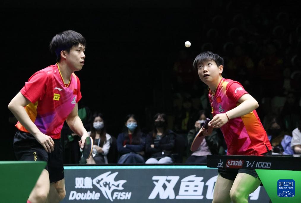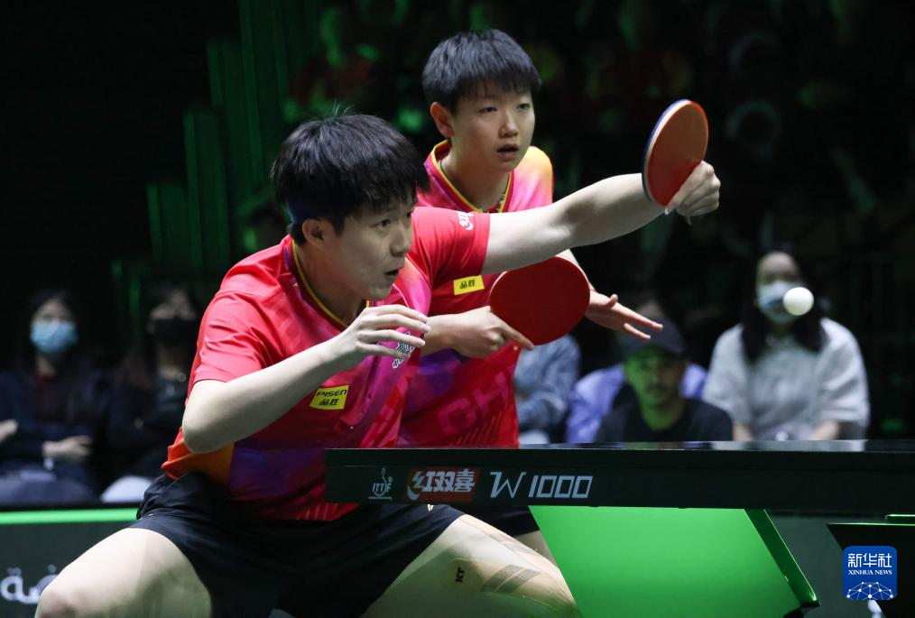 5月9日,王楚钦/孙颖莎(右)在比赛中。新华社记者 王海洲 摄
