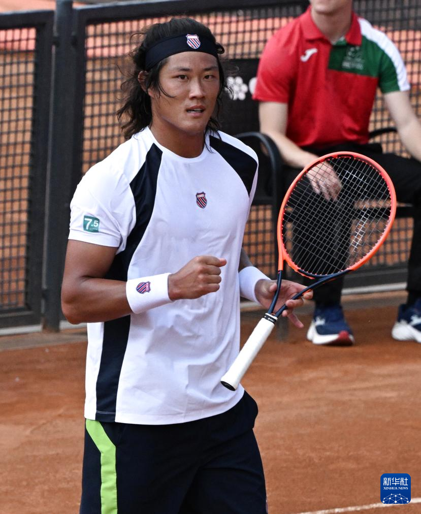 5月10日,张之臻在比赛中庆祝得分。新华社发(阿尔贝托·林格利亚摄)