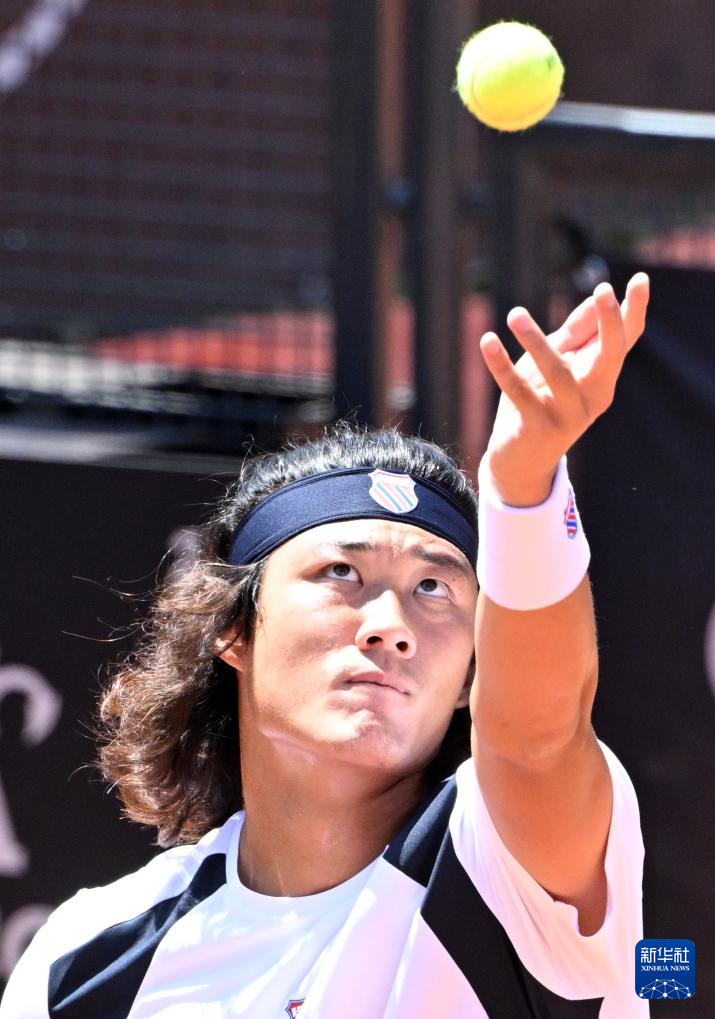 5月10日,张之臻在比赛中发球。新华社发(阿尔贝托·林格利亚摄)