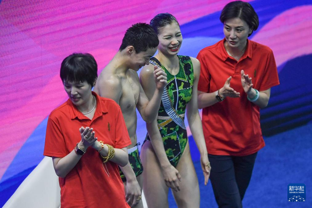 5月10日,上海安踏队选手裘心怡(右二)/王赵来(左二)在得知成绩后。新华社记者 杜子璇 摄