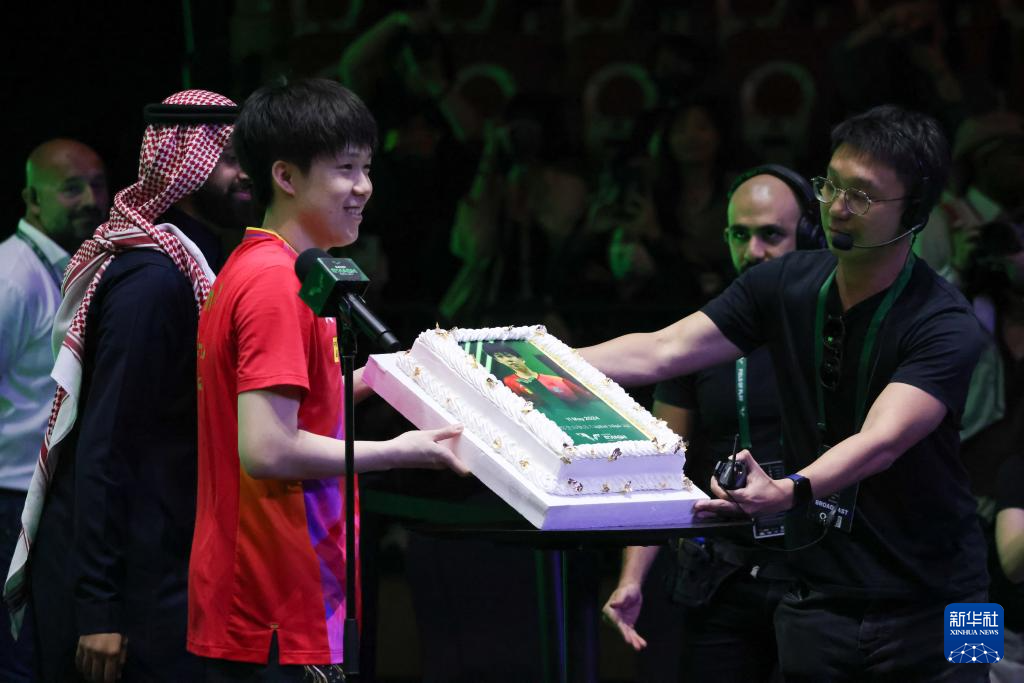 5月11日,沙特赛事组委会在赛后为夺冠的王楚钦(前左)送上生日蛋糕。新华社记者 王海洲 摄