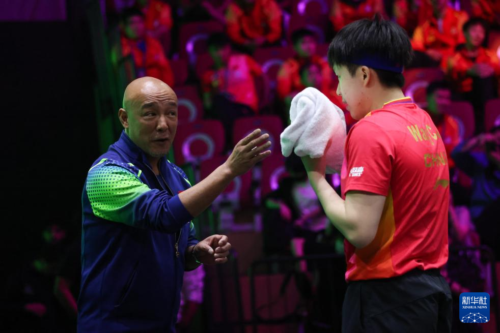 5月11日,王楚钦(右)在比赛间隙与教练肖战交流。新华社记者 王海洲 摄