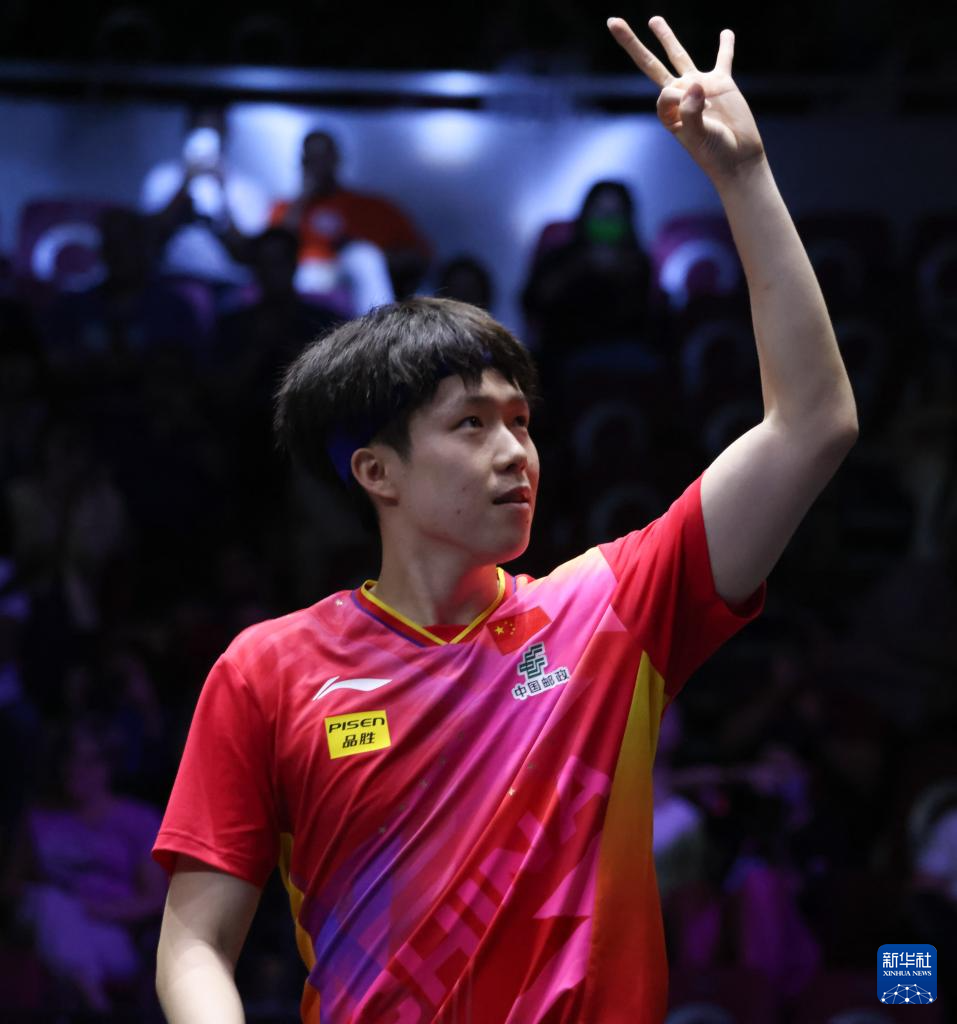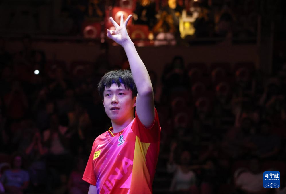 5月11日,冠军中国选手王楚钦在颁奖仪式前向观众致意。新华社记者 王海洲 摄
