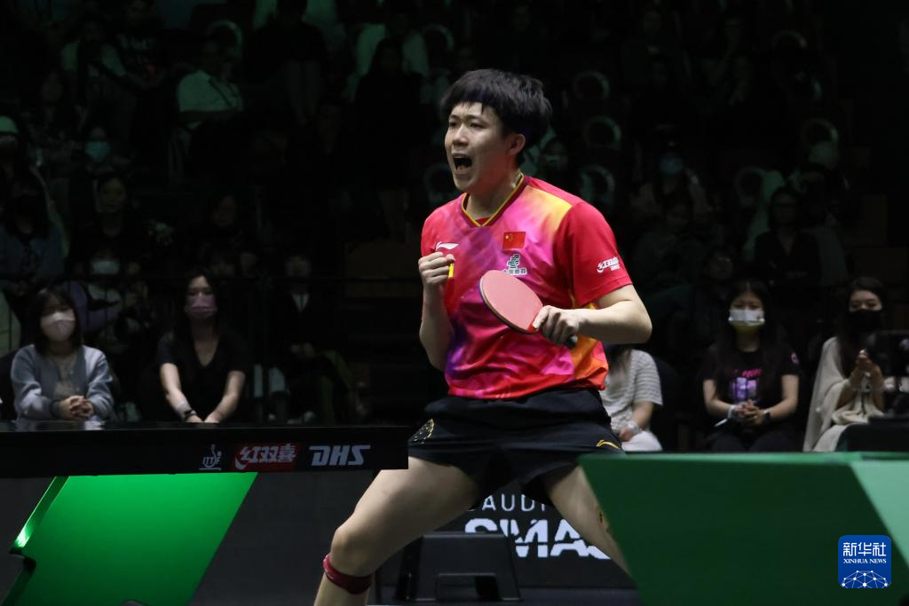 5月11日,王楚钦在比赛中庆祝得分。新华社记者 王海洲 摄