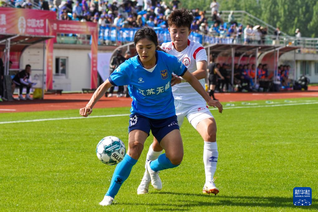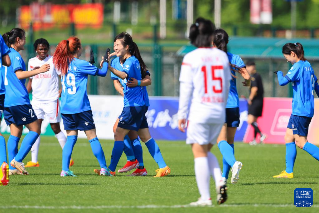 5月12日,江苏无锡队球员霍悦欣(右)在比赛中破门得分。新华社发(杜懿摄)
