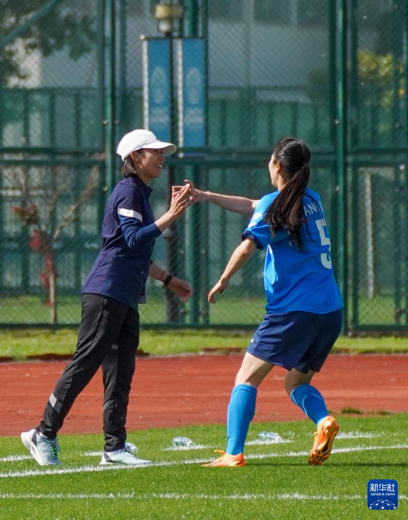 5月12日,江苏无锡队球员杨茜(右)和主教练陈婉婷击掌庆祝进球。新华社发(杜懿摄)