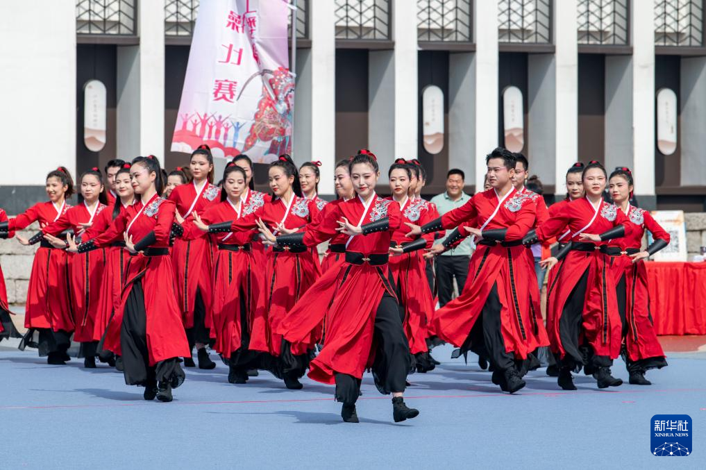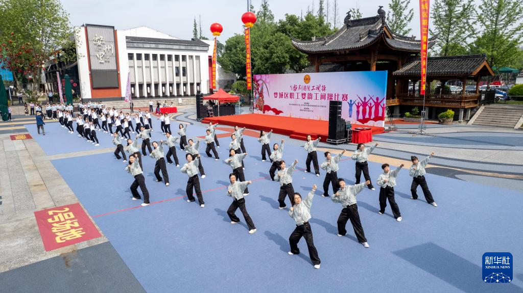 5月13日,婺城区职工在金华市古子城广场参加“婺韵工间操”比赛。新华社发(胡肖飞 摄)