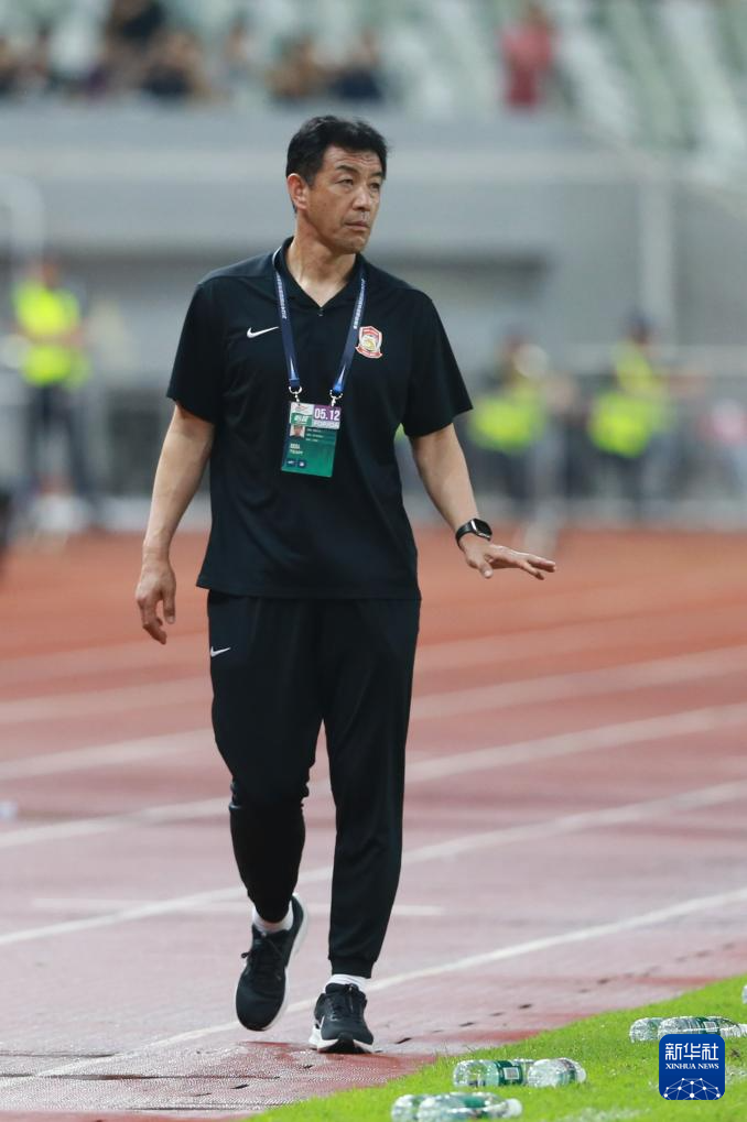 5月12日,青岛西海岸队主教练黑崎久志在场边指挥。新华社发(彭志刚摄)
