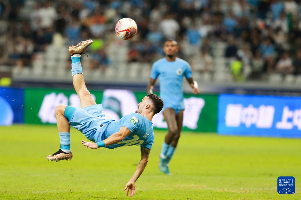 5月12日,深圳新鹏城队球员豪尔赫·奥尔蒂斯(前)在比赛中倒钩射门。新华社发(彭志刚摄)