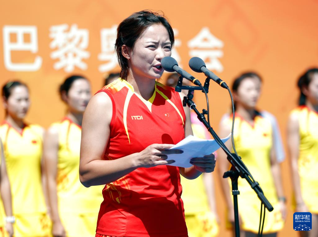5月13日,国家女子曲棍球队队员欧紫霞在出征仪式上发言。新华社记者 雒圆 摄