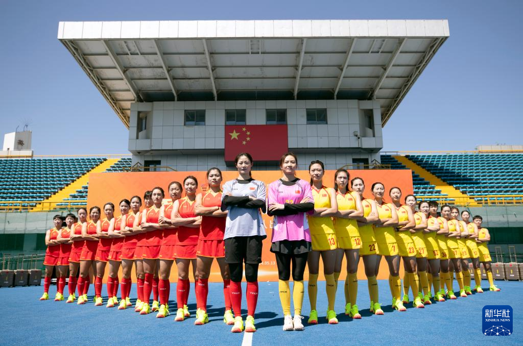 5月13日,国家女子曲棍球队在出征仪式结束后合影。新华社记者 雒圆 摄