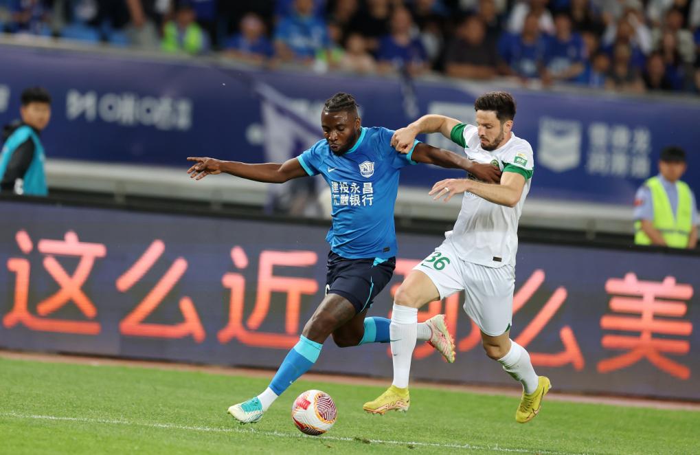 5月12日,深圳新鹏城队球员朱宝杰(前左)在比赛中与青岛西海岸队球员爱德华多(前右)拼抢。新华社发(彭志刚摄)