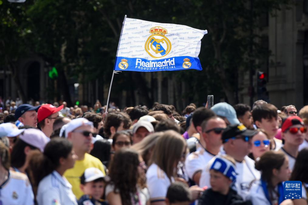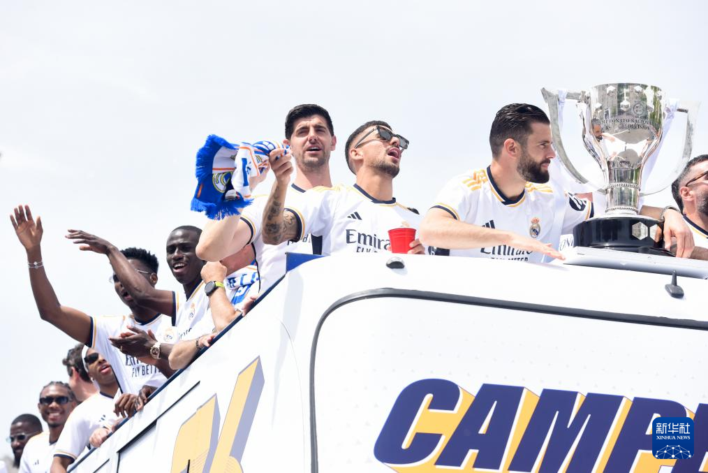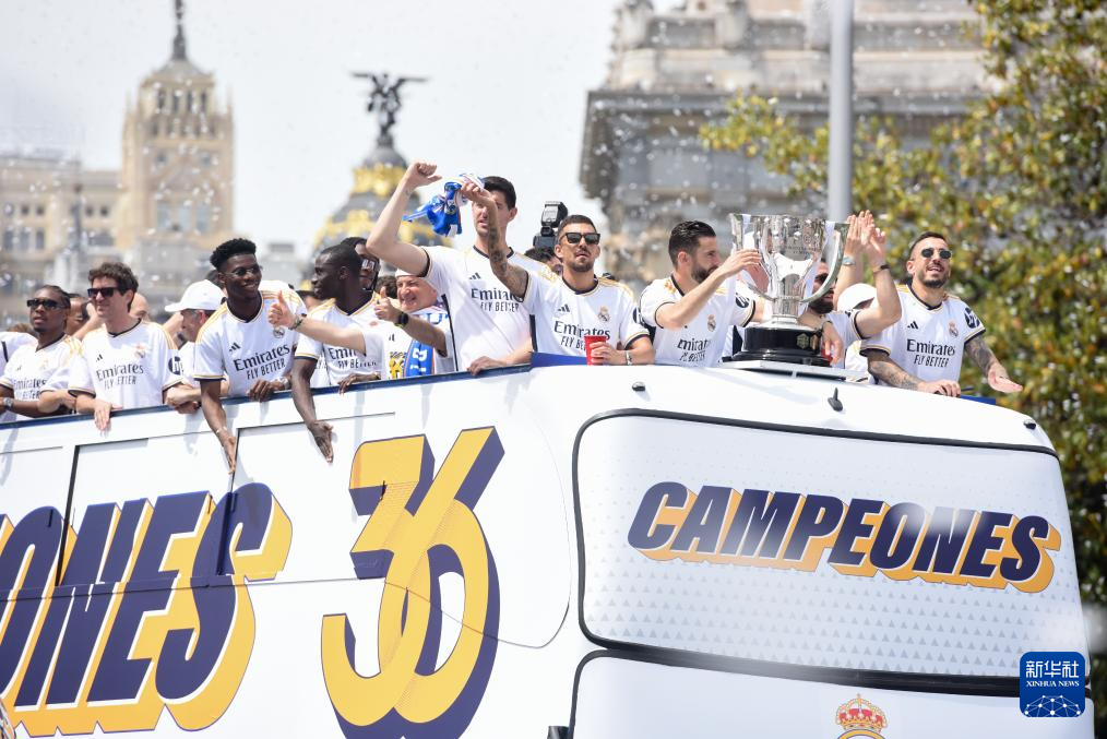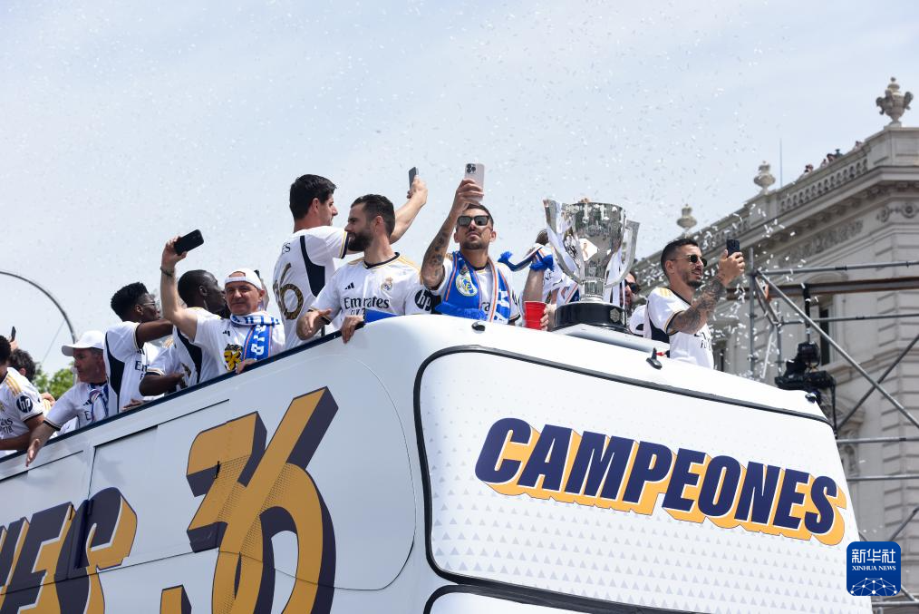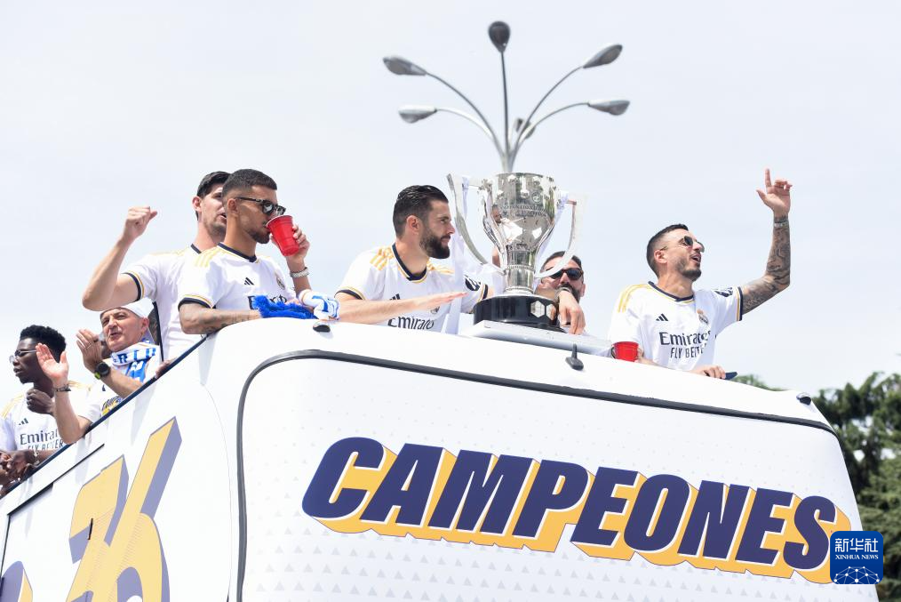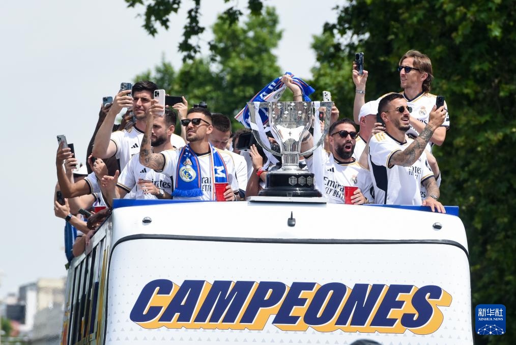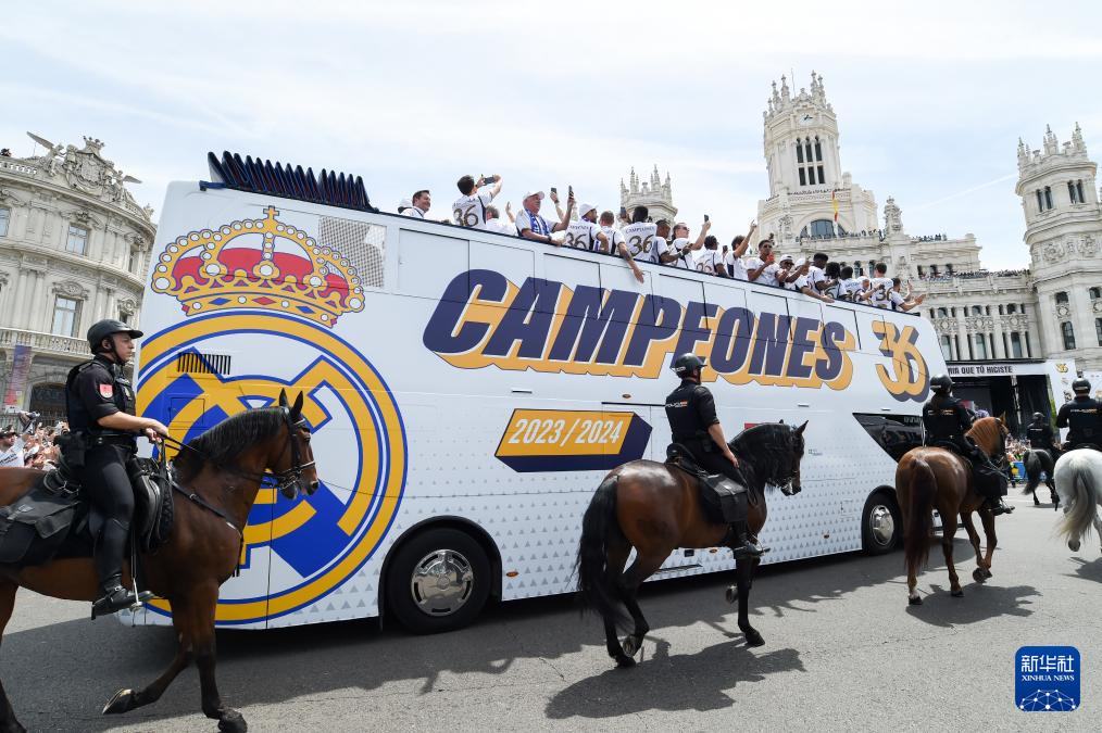 当日,皇家马德里队在马德里市中心参加巡游活动,与球迷共同庆祝夺得2023-2024赛季西班牙足球甲级联赛冠军。