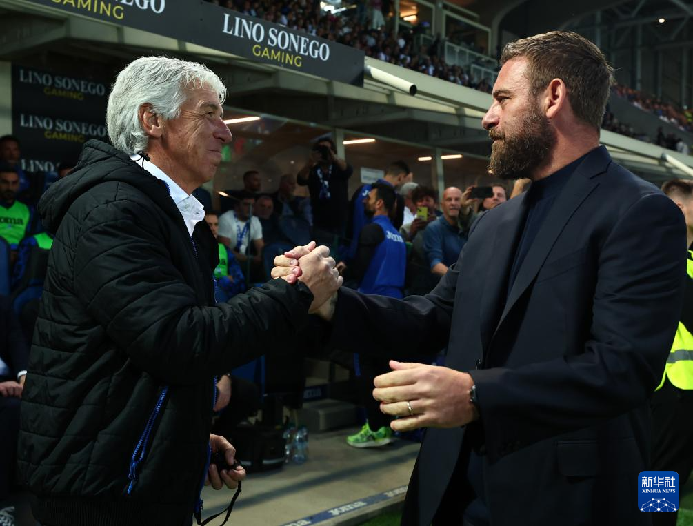 5月12日,亚特兰大队主教练加斯佩里尼(左)与罗马队主教练德罗西在赛前握手。新华社发(阿尔贝托·林格利亚摄)