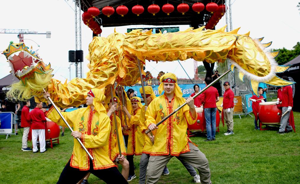 5月11日,在捷克首都布拉格举行的第27届布拉格龙舟节上,捷克青少年正在表演舞龙。新华社发(达娜·科什奈洛娃摄)