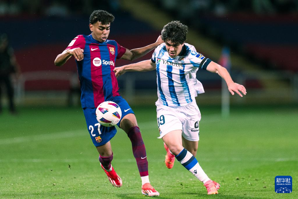5月13日,巴塞罗那队球员亚马尔(左)与皇家社会队球员阿兰布鲁在比赛中拼抢。新华社发(胡安·戈萨摄)