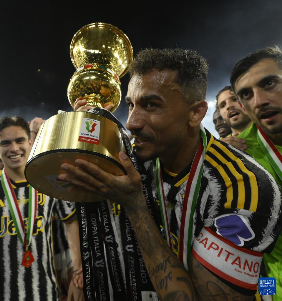 5月15日,尤文图斯队球员达尼洛在比赛后庆祝夺冠。新华社发(奥古斯托·卡萨索利摄)