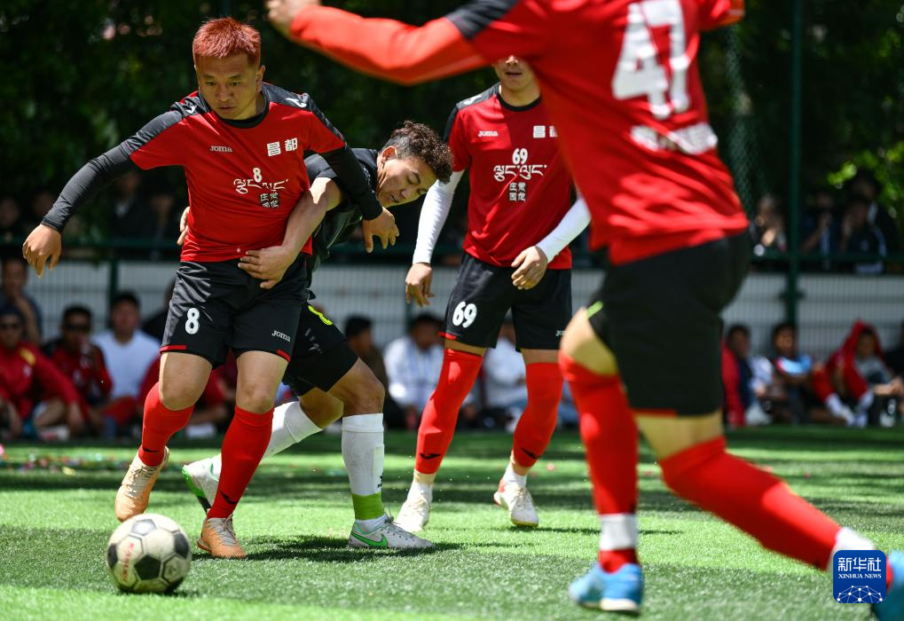 5月15日,昌都队球员曲旺(左)在比赛中拼抢。新华社记者 晋美多吉 摄