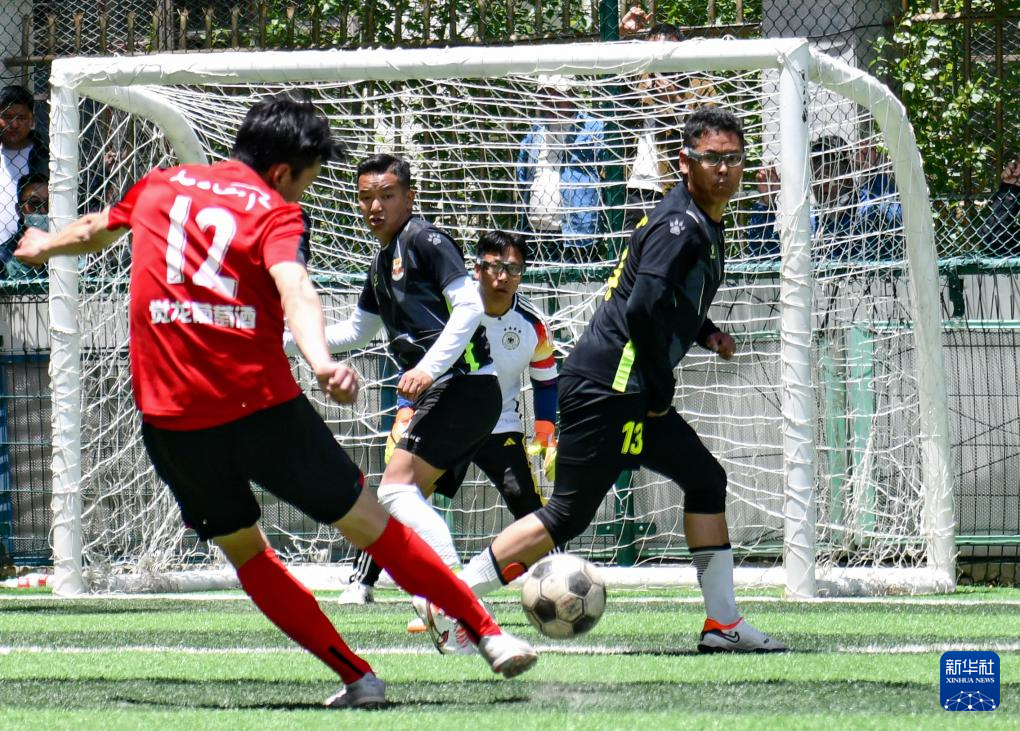 5月15日,昌都队球员西热泽仁(前)在比赛中射门。新华社记者 晋美多吉 摄