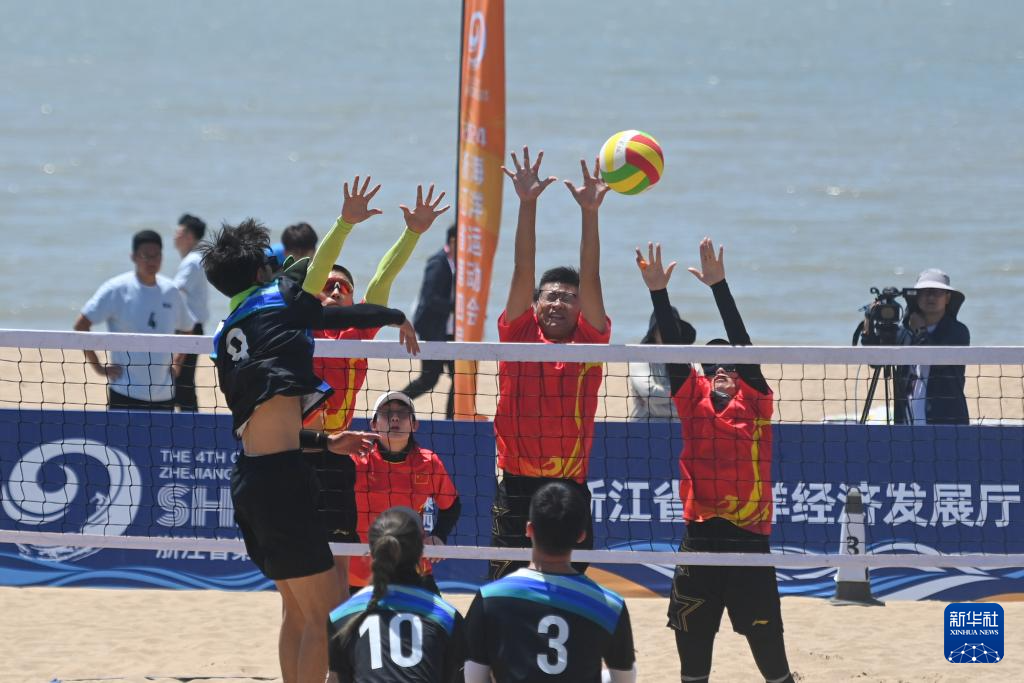 5月18日,浙江金华代表队选手在沙滩气排球比赛中拦网。新华社记者 黄宗治 摄