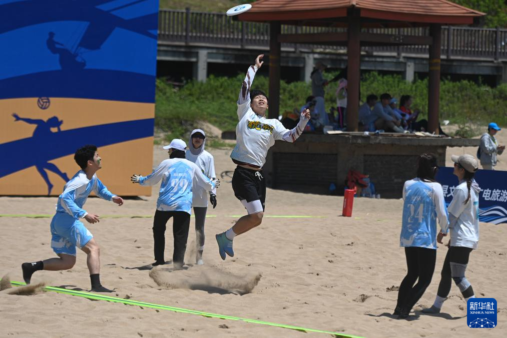 5月18日,浙江杭州代表队选手(中)在沙滩飞盘比赛中。新华社记者 黄宗治 摄