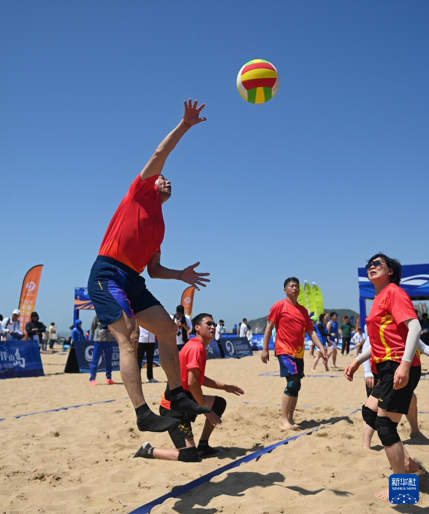 5月18日,浙江杭州代表队选手在沙滩气排球比赛中。新华社记者 黄宗治 摄