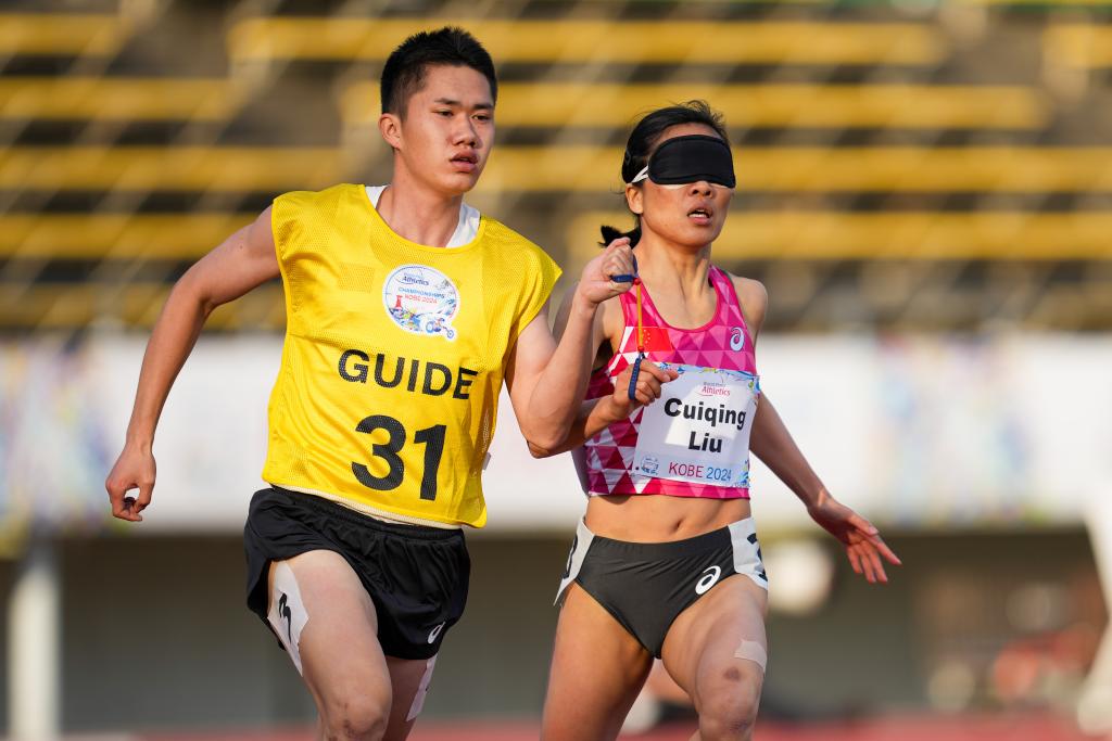 5月17日,中国选手刘翠青(右)与领跑员陈圣明在女子400米T11级预赛中。最终,她以58秒36的成绩晋级决赛。