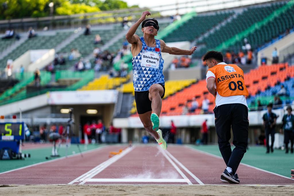 5月17日,中国选手陈世昌(左)在男子跳远T11级决赛中。最终,他以6米62的成绩获得冠军,并打破赛会纪录。