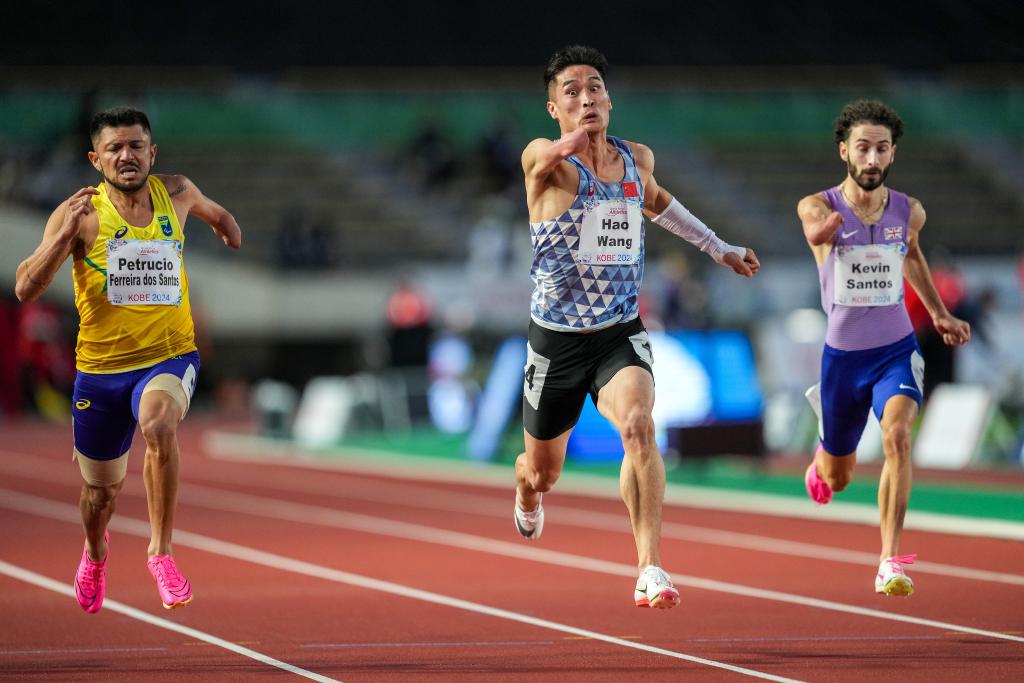 5月17日,中国选手王浩(中)在男子100米T47决赛中。最终,他以10秒88的成绩获得季军。